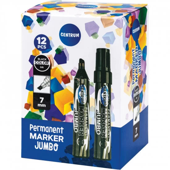 Huopakynä Jumbo (permanent marker Jumbo), jossa on viisto kärki. Kärjen leveys 7mm ja väri on musta. Pysyvä, permanent, väri.