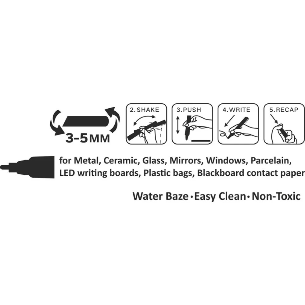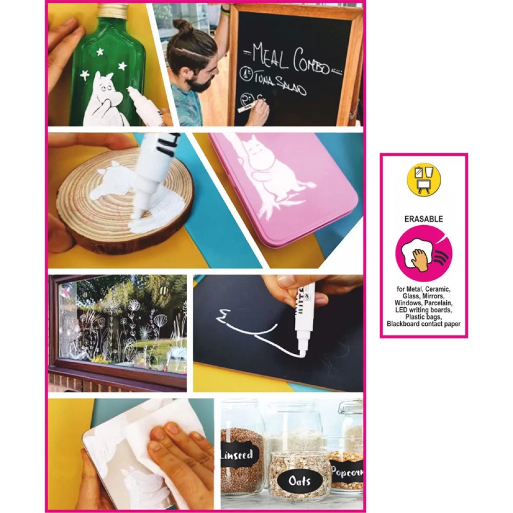 Tämä valkoista jälkeä jättävä liitukynä sopii monille eri pinnoille, kuten metallille, keramiikalle, lasille, peileille, ikkunoille, posliinille, LED-kirjoitustauluille, muovipusseille ja liitutaulupaperille. Merkinnät on helppo pyyhkiä kostealla liinalla, joten kynä soveltuu hyvin väliaikaiseen kirjoittamiseen ja korostamiseen.