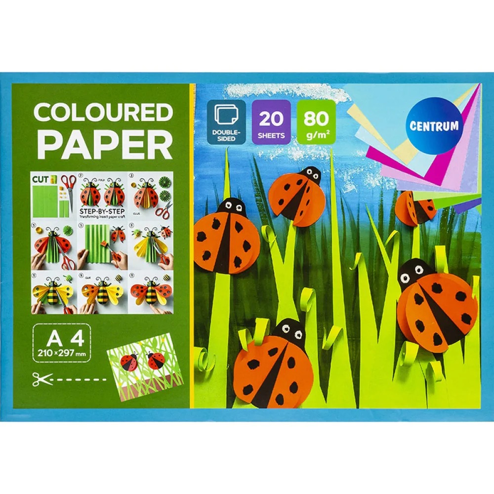 Värikäs A4-kokoinen askartelupaperisetti piirtämiseen ja askarteluun. Pakkauksessa on 10 kirkasta väriä, joista jokaisesta on kaksi arkkia.